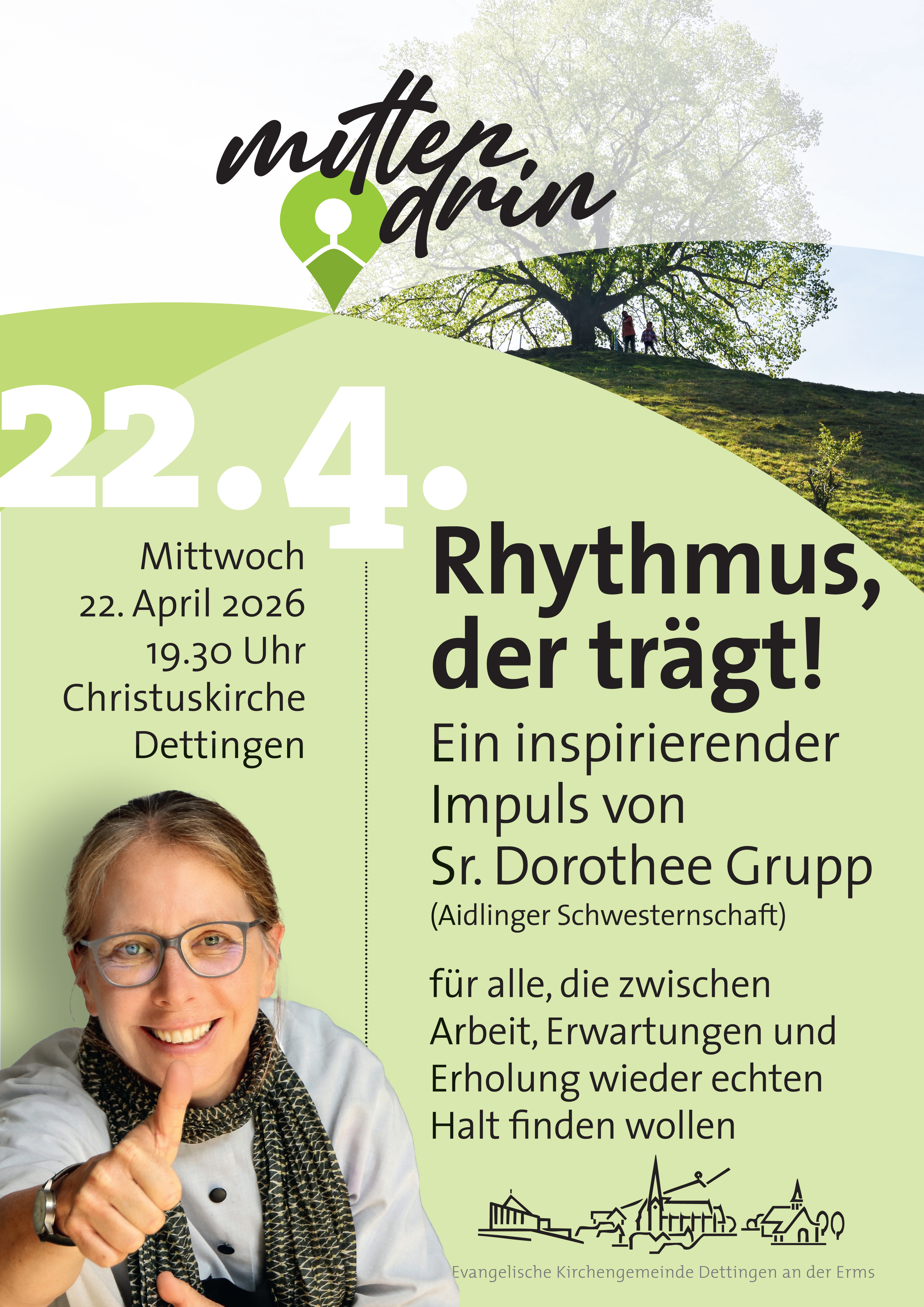 Die Veranstaltung findet am Mittwoch, den 22. April 2026 um 19.30 Uhr im Rahmen der Veranstaltungsreihe „mittendrin“ in der Christuskirche in Dettingen Buchhalde statt.