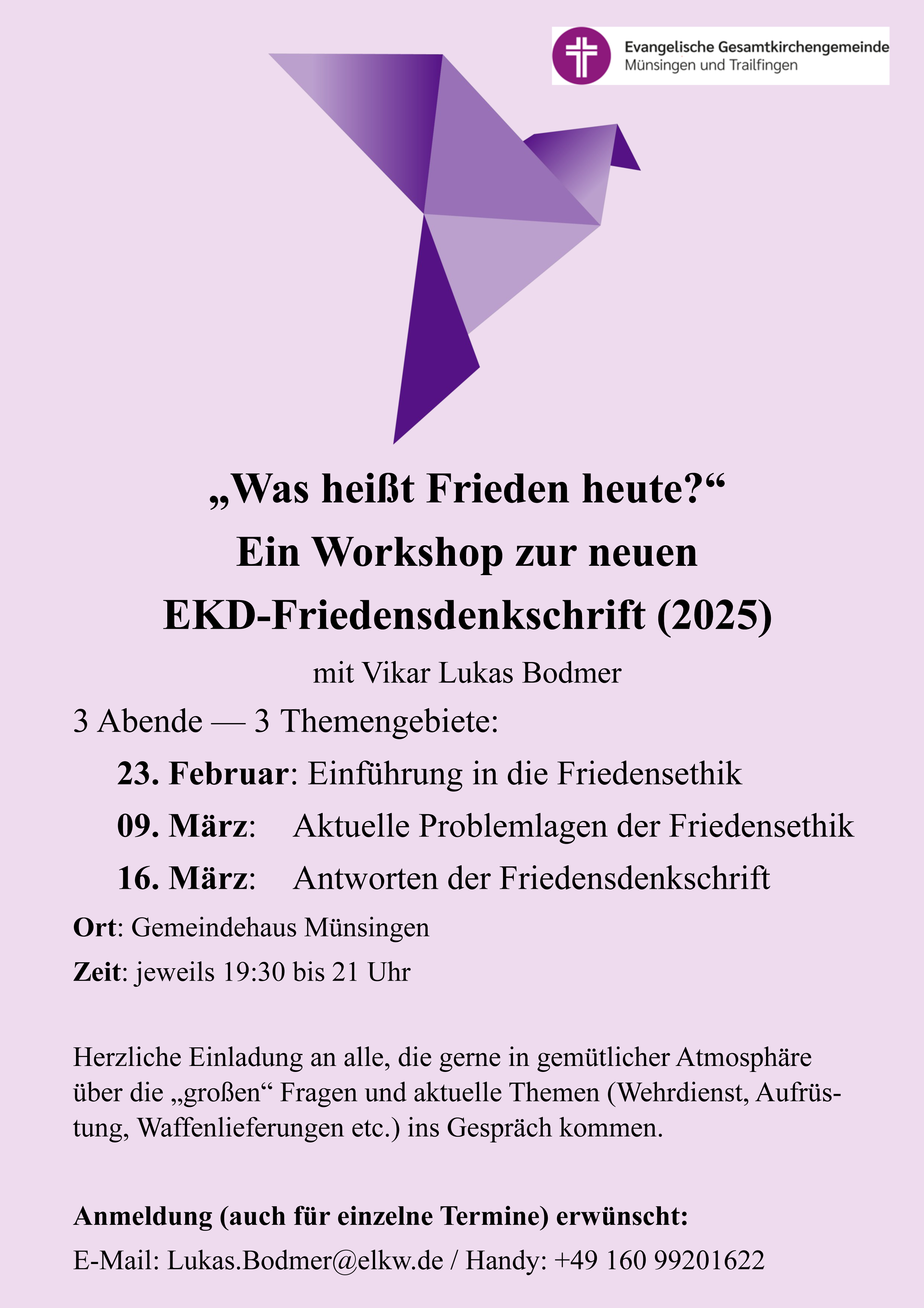 Daher herzliche Einladung zum Workshop zur neuen EKD-Friedensdenkschrift (2025) an folgenden Terminen: 23. Februar, 09. März und 16. März jeweils von 19:30 bis 21 Uhr im Gemeindehaus Münsingen.