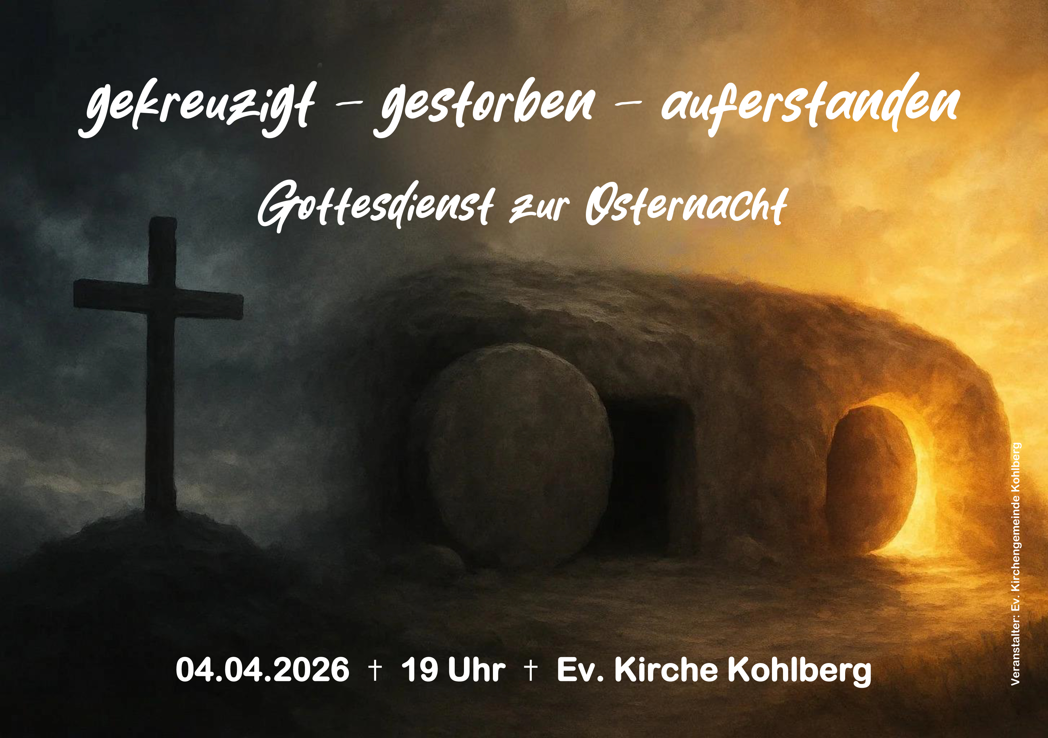 Herzliche Einladung zum Gottesdienst zur Osternacht am 4. April um 19 Uhr in der Kohlberger Kirche. Jesus wurde zum Tod verurteilt und gekreuzigt. Er ist gestorben und wurde begraben. Doch er hat den Tod besiegt und ist auferstanden. Dass Jesus diesen Weg für uns gegangen ist, darüber wollen wir in der Osternacht nachdenken und in Liedern, Gebeten und einem Impuls den Blick auf Jesus richten. Beim Abendmahl mit Oblaten, Wein und Traubensaft erinnern wir uns daran, dass Jesus sein Blut für unsere Schuld am Kreuz vergossen hat.
