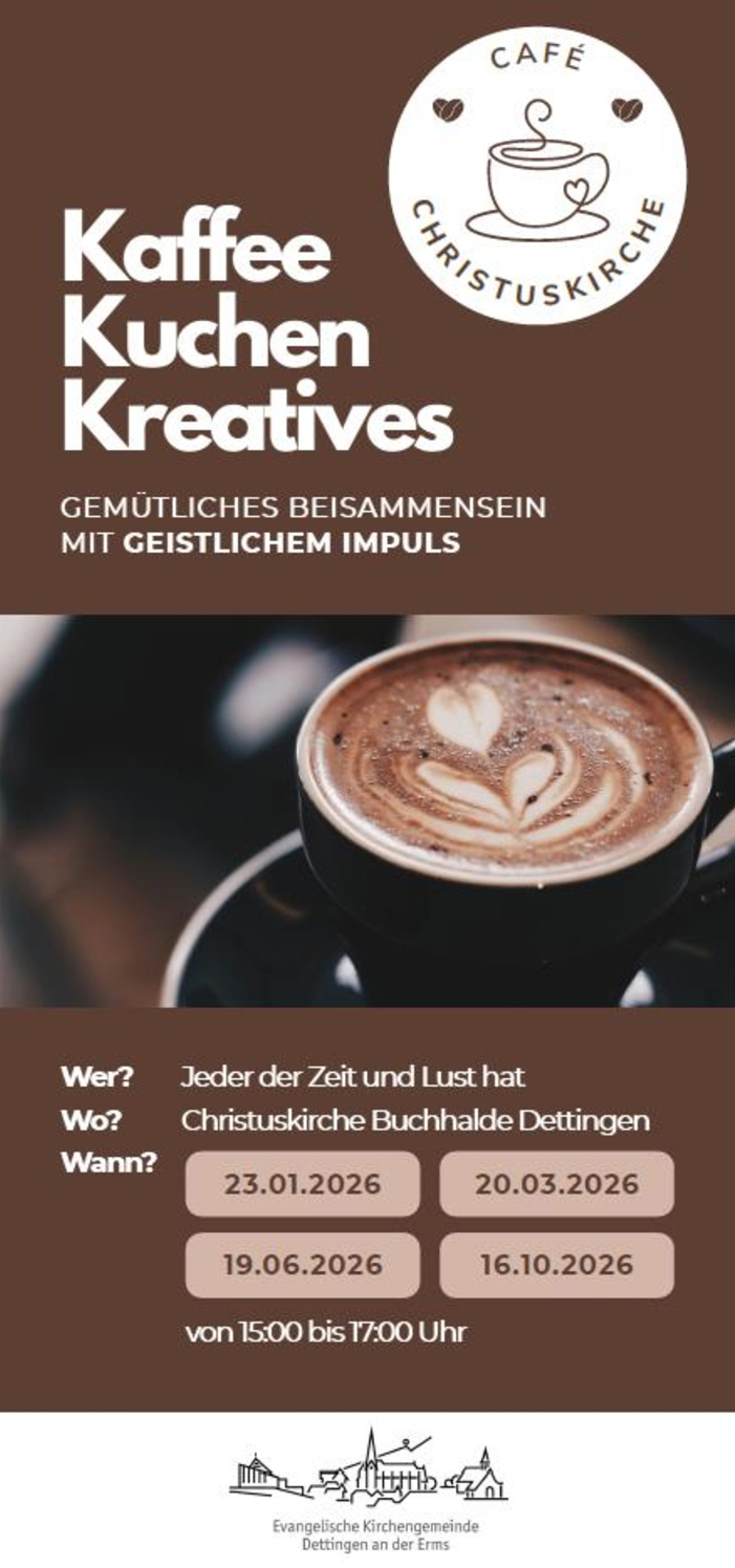 Am Freitag, den 23. Januar ist das Café Christuskirche in der Buchhalde / Dettingen wieder von 15 bis 17 Uhr geöffnet.