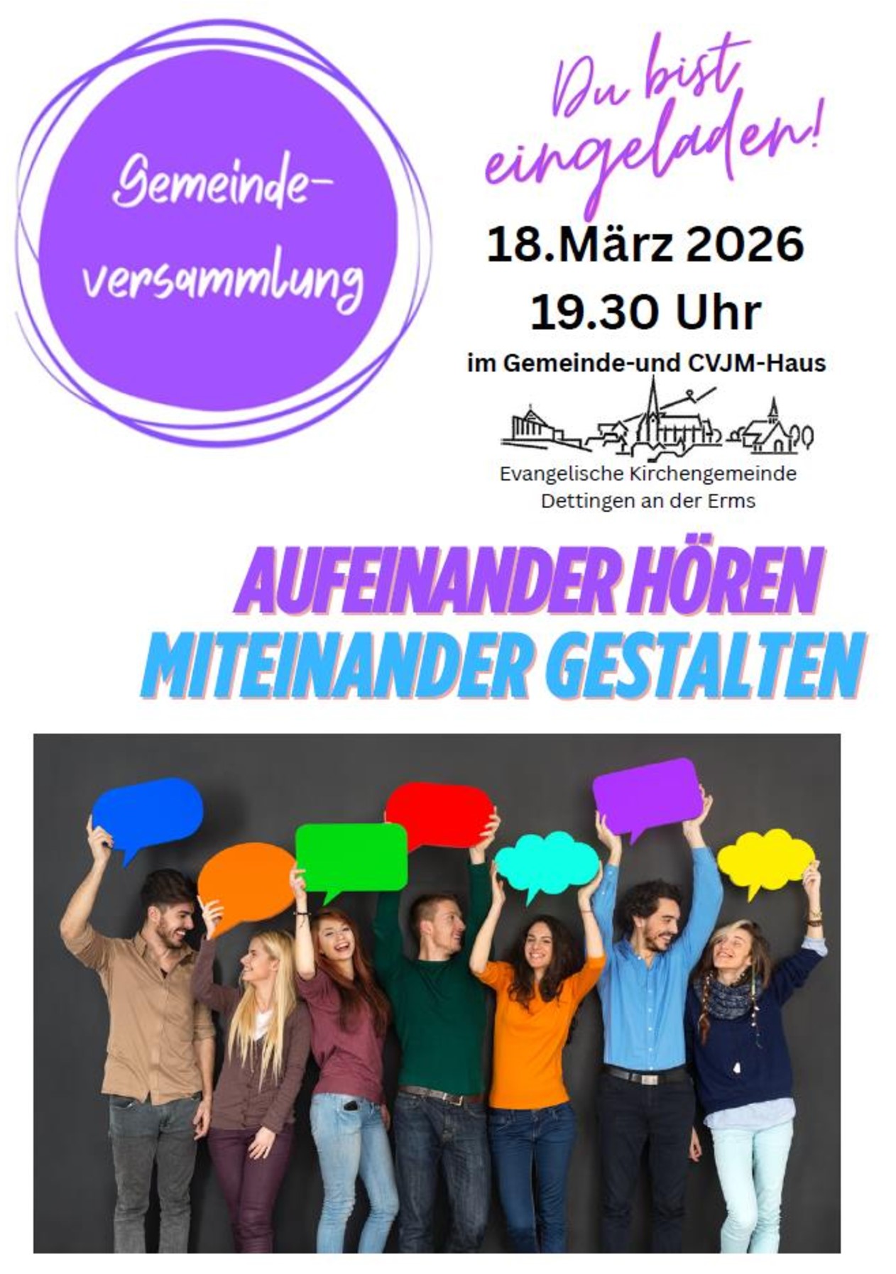 Als Gemeinde sind wir miteinander unterwegs. Doch in einer großen Gemeinde passiert es leicht, dass wir uns gegenseitig aus dem Blick verlieren und gar nicht mitbekommen, was andere bewegt. Deshalb geht es in der Gemeindeversammlung darum, uns gegenseitig Anteil zu geben und miteinander darüber ins Gespräch zu kommen, was uns gerade beschäftigt und Freude oder Sorgen bereitet. Wir würden uns sehr freuen, wenn sich alle, denen die Gemeinde am Herzen liegt, an diesem Abend beteiligen.